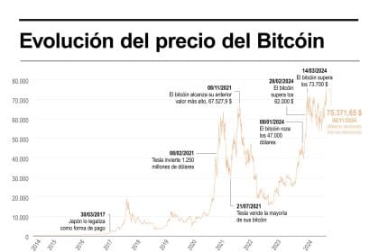 El bitcóin sube casi el 8 % tras marcar un nuevo máximo cercano a los 75.400 dólares