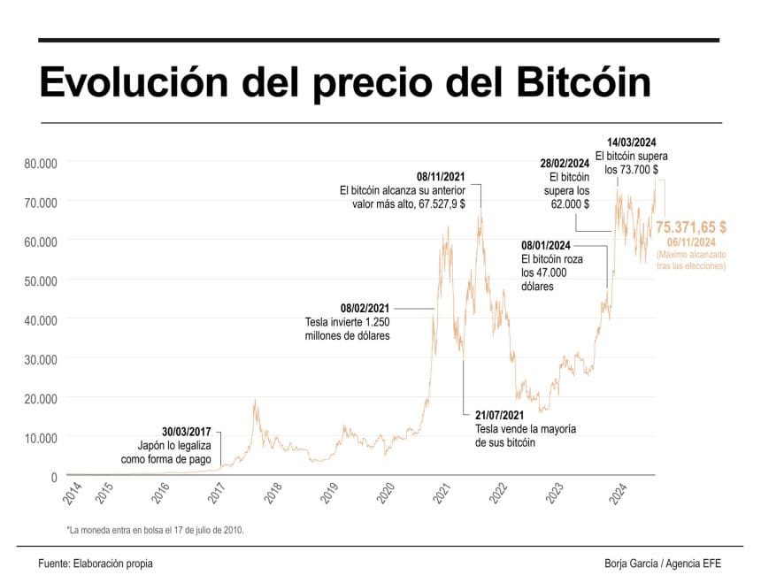 El bitcóin sube casi el 8 % tras marcar un nuevo máximo cercano a los 75.400 dólares
