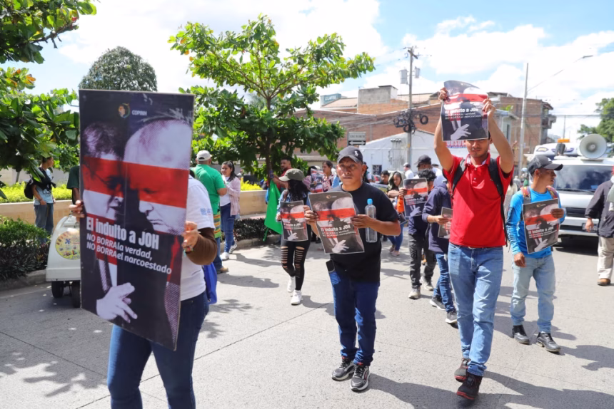Campesinos protestan frente a la Embajada de EE.UU. en Tegucigalpa contra el indulto de Trump al expresidente Juan Orlando Hernández, condenado por narcotráfico.
