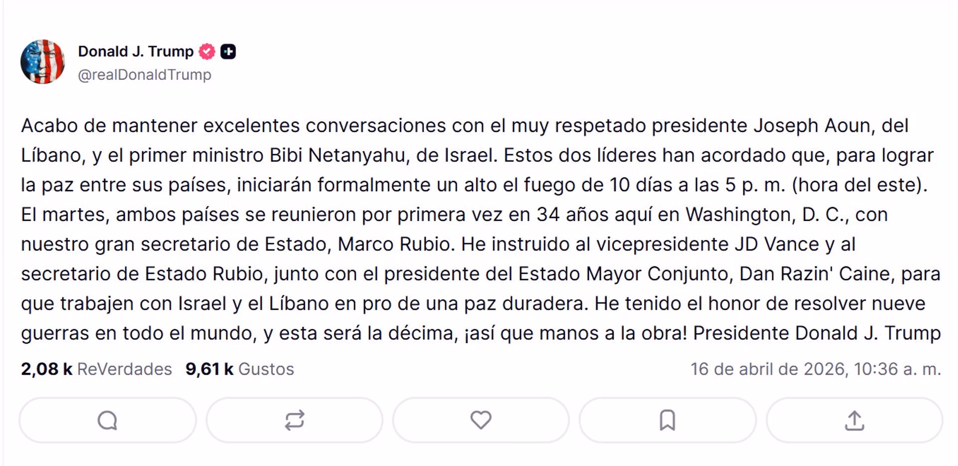 El mandatario informó que el cese de hostilidades entró en vigor a las 5:00 p.m. (hora del este), luego de mantener conversaciones telefónicas con el presidente libanés, Joseph Aoun, y el primer ministro israelí, Benjamin Netanyahu.